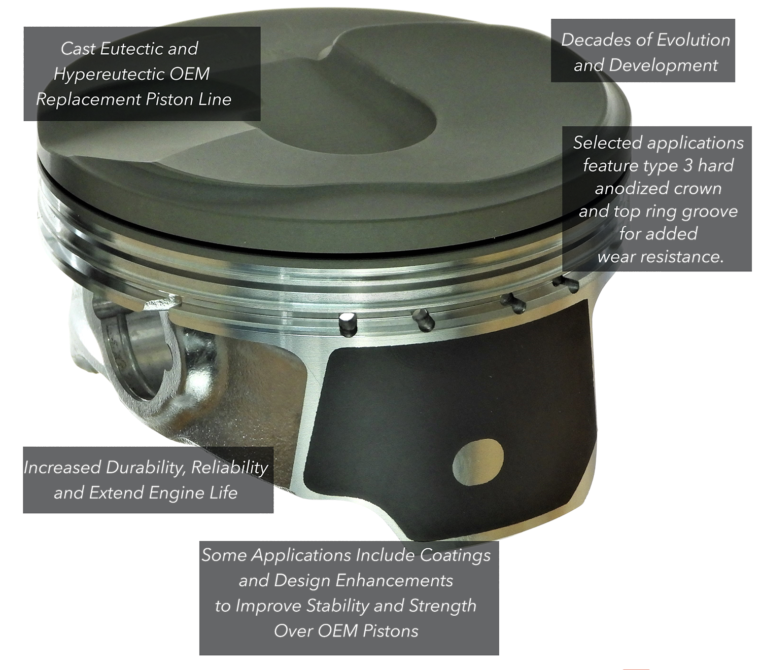 Silv-O-Lite pistons Include all the features of OE pistons, while exceeding the performance of OE pistons. At cost effective and affordable prices, Silv-O-Lite pistons often feature engineering solutions in design, materials and coatings.